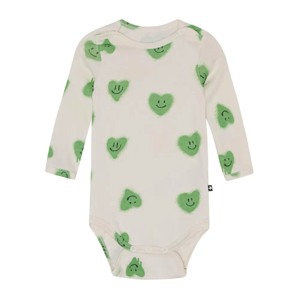 Fineste lysegrønne babybody med lange ærmer, fremstillet af økologisk bomuldsjersey. Bodyen har en praktisk trykknap i kraven og mellem benene, hvilket gør den legende let at få af og på. Den præsenterer et charmerende alloverprint med mørkegrønne hjerter