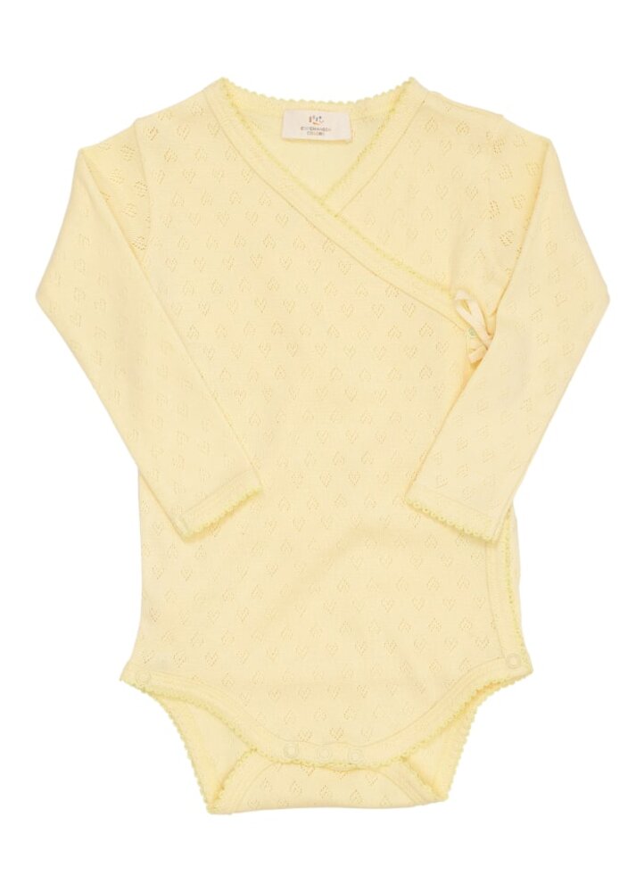 Blød bodystocking med lange ærmer og skrå lukning. Fremstillet af økologisk blød bomuld med hjerte mønster. GOTS Certificeret