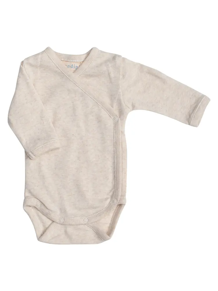 Stribet slå-om body med trykknapper til baby første tid. Smalle striber. Syet af blød økologisk bomulds rib.