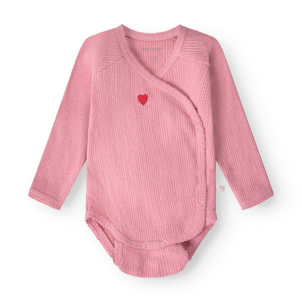 Blød børstet pointelle slå-om bodystocking med borderet lille rødt hjerte. Ekstra knapper i bunden, så man lige kan bruge den lidt længere tid. Lavet i blød økologisk bomuld.
